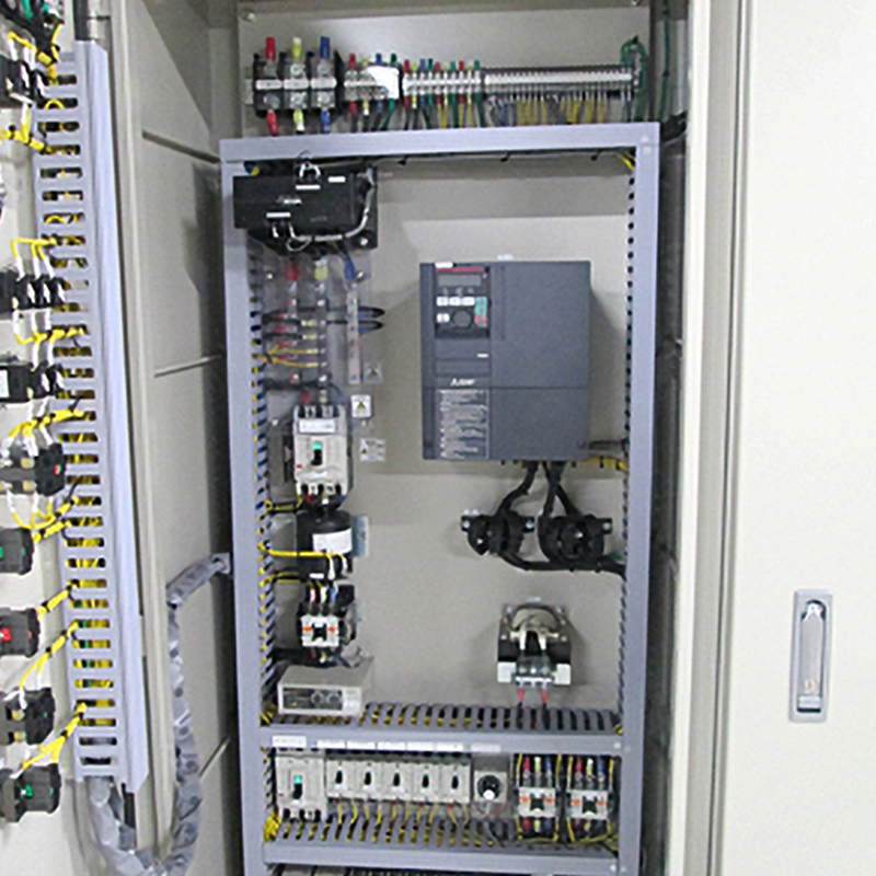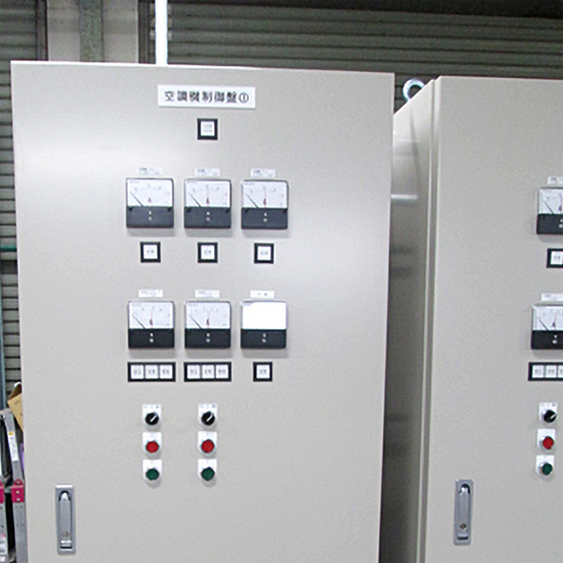 制御盤 制御盤は電気設備を便利に、安全に、効率良く使用する為に、様々な制御方法によって作られます。 制御用の機器は様々なメーカーがより良い性能のものを開発しております。 使い勝手だけではなく近年注目されている省エネを促進出来る機能も進んでおります。 ニシナ製作所では利便性は勿論、メンテナンス性なども考え、ご提案をさせて頂いております。 呼び出し装置や警報回路など集中運用管理します。大規模な施設では効率の良い運用が求められます。 複数の空調機を遠方・手元発停などでまとめて動かします。 計器類も用途に応じて選定・設置します。 電動機を電磁開閉器とインバーターの併用で、効率的な運用をします。 電動機は保護機器や回路を間違うと大事故に繋がります。機種の選定、動作試験は慎重に行います。